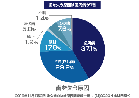 日本人が永久歯を失う原因の中でもっとも多いのは、むし歯ではなく歯周病です。歯周病は自覚症状があまりなく、気づいた時には重症化していることがあります。悪化すると歯がポロッと抜け落ちてしまうことがあるため、定期的に検診を受けて早期発見・治療を心がけましょう。